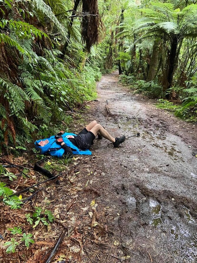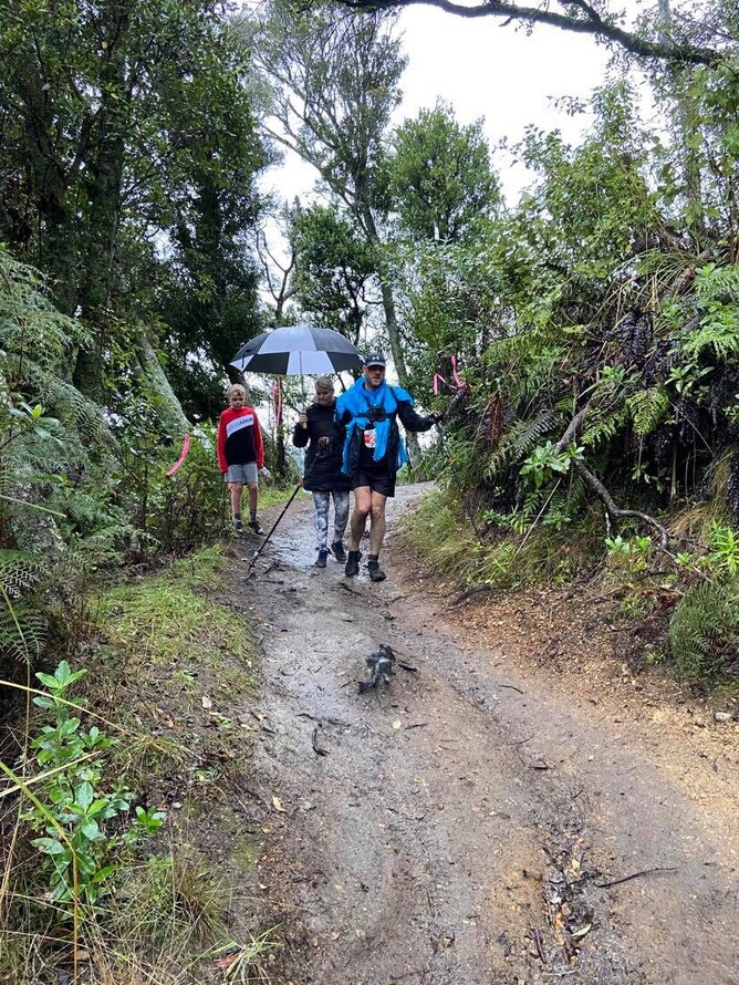 The 5.5km walk was next. Our support crew helped us get organised for the last leg. We started off pretty wet and a bit tired but at a good pace. Alan was seemingly positive and actually felt really good. The first 1.5km went well and we enjoyed the slight rain and views of the lake. Alan started to lose strength and control of his legs and hips. He had walking sticks to help him, but even with these the going was becoming increasingly slow. About two thirds of the way around his family joined us, and brought Alan some biotin, a supplement that helps the nerves communicate with the muscles for people with MS (Alan has his own supplement company, so is pretty clued up on what to take) and an energy drink. Having a sit down or lie down helped the muscles recover so the nerves worked a bit better and he could keep going. The last 4kms was a struggle but Alan was a champ and determined to finish. His courage and strength, as he was losing the ability to control his body, was inspiring. He was not going to give up. I was getting tired at this stage and was pleased for our support crew helping Alan with positive encouragement.