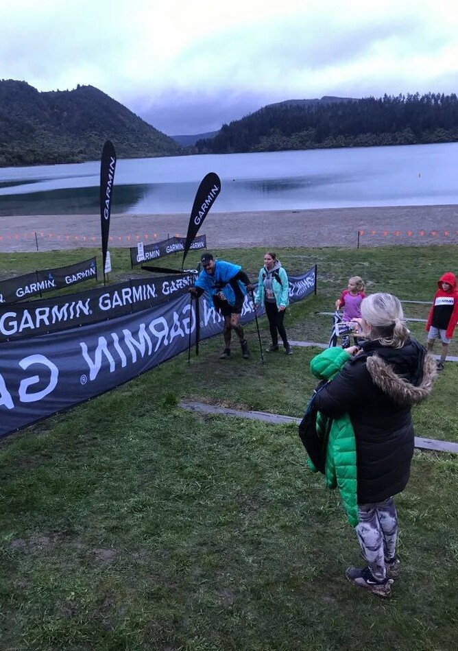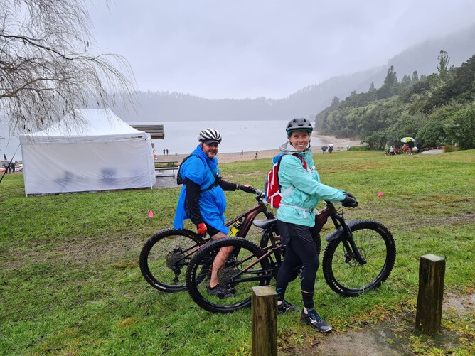 Alan walked twice a week, and had a practice walk around the Rotorua Blue Lake about 4 weeks before the event to see how he pulled up. He did it in 2 hours with his wife and 3 kids support, which was pretty impressive. We then realised we had underestimated the mountain bike section of the event so started to train at the Redwoods and the Te Miro mountain bike track. This was quite a challenge as when Alan gets off the bike (on steep hills or if I stop in front of him quickly) he can't stand and falls over, as he can not feel his feet. My goal was to get him through the bike in one piece and not fall off myself. I am a runner not a cyclist. He was fantastic on the bike and ended up coaching me through mountain biking. We were all set for the event day.